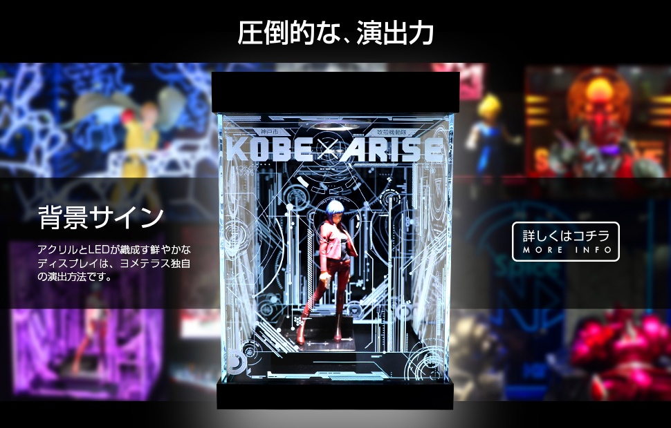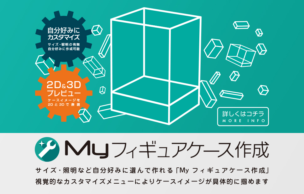 ヨメテラスではそんなご自分だけのMyフィギュアケースを作るお手伝いをさせていただきます。サイズはもちろん照明の有無や色、ご予算に応じた内容でご指定できます。